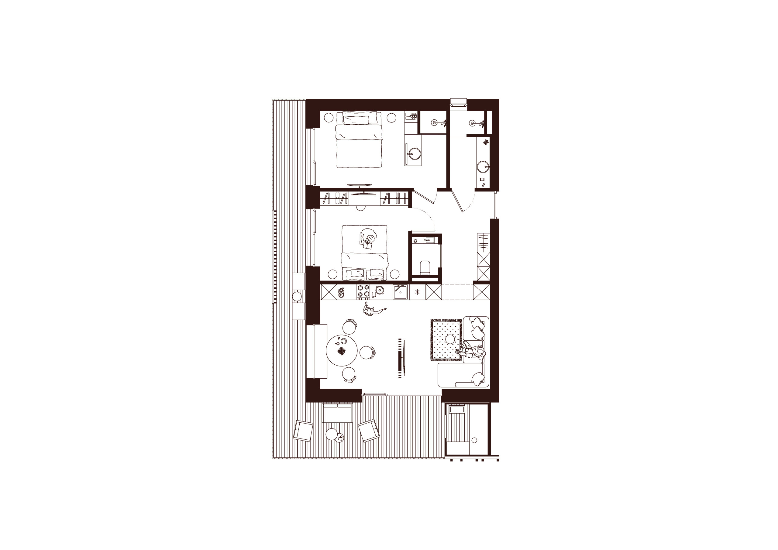 The Aira Suite features three spacious bedrooms with king-size beds, guaranteeing relaxation and comfort. Two modern bathrooms and 1 extra toilet ensure sufficient privacy and convenience. The fully equipped kitchen with an induction hob invites communal cooking and offers all necessary appliances such as a dishwasher, coffee machine, and freezer.