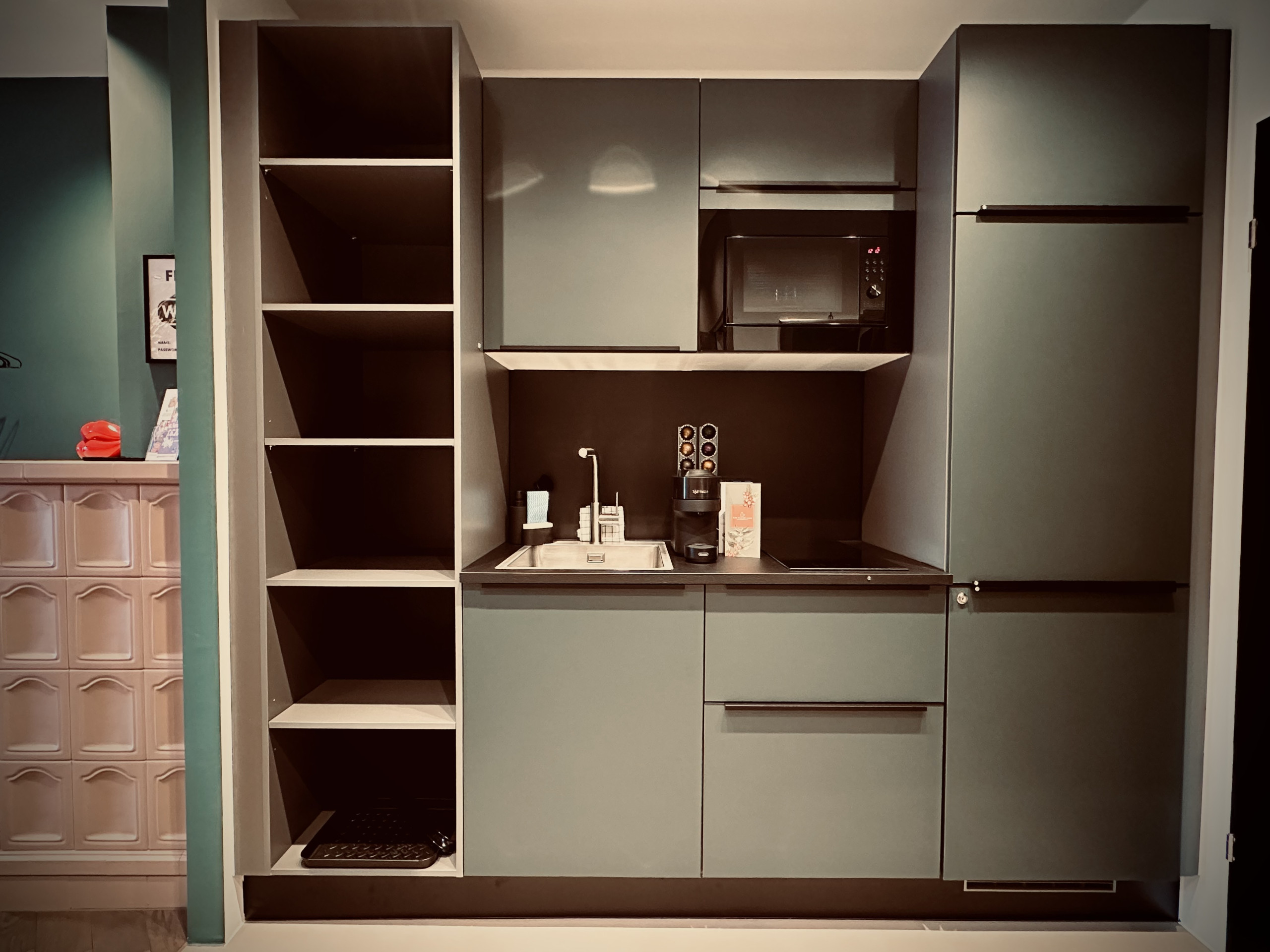 In the hotplate of glass ceramics open plan kitchen, refrigerator, microwave, freezer, dishes/cutlery, kitchen utensils, coffee machine, toaster and kettle are provided.