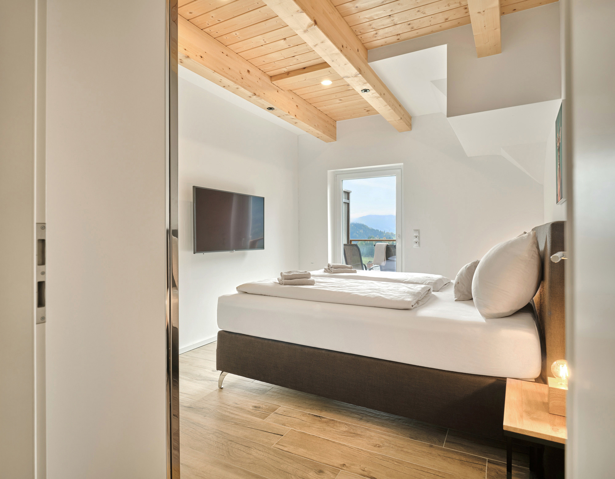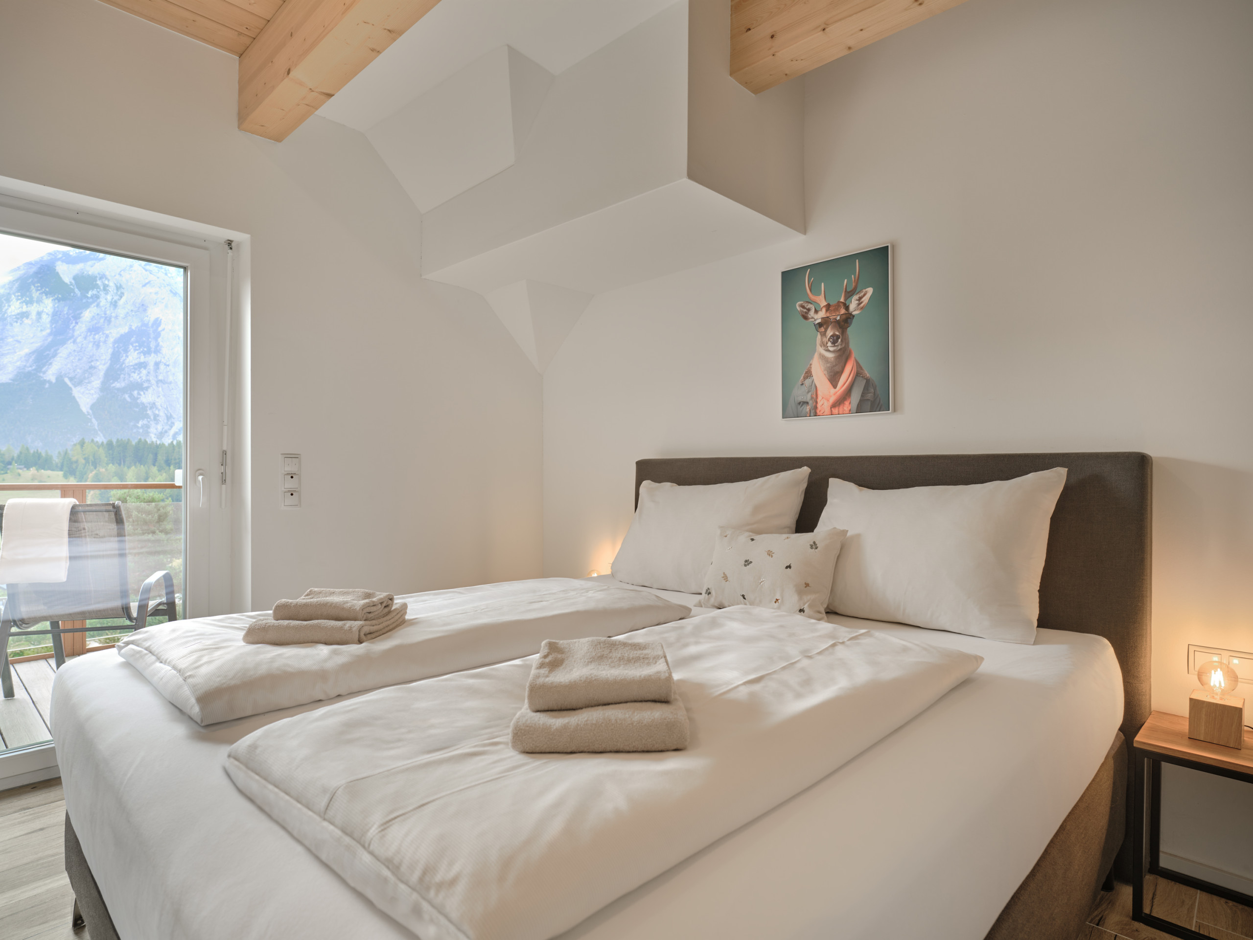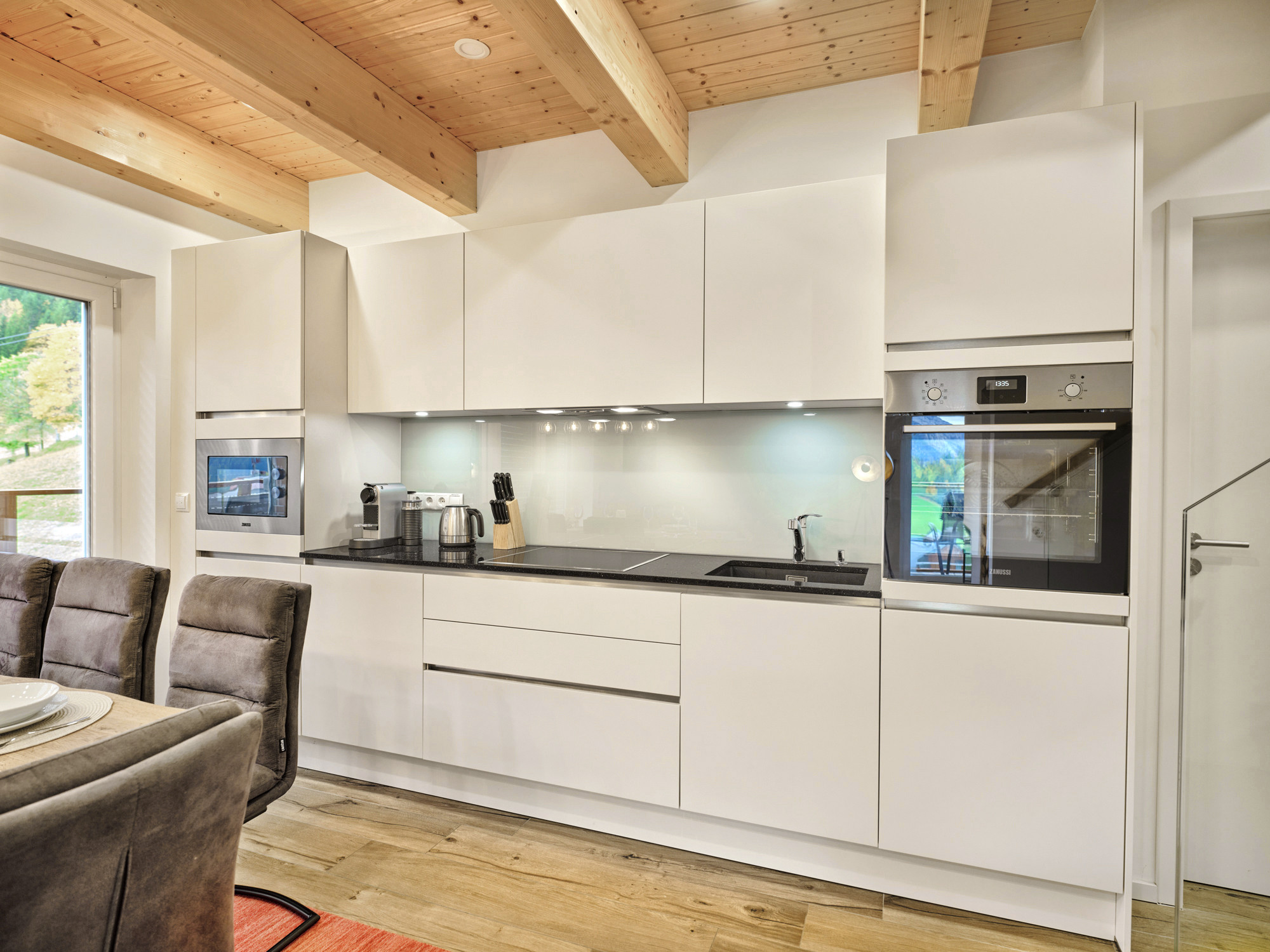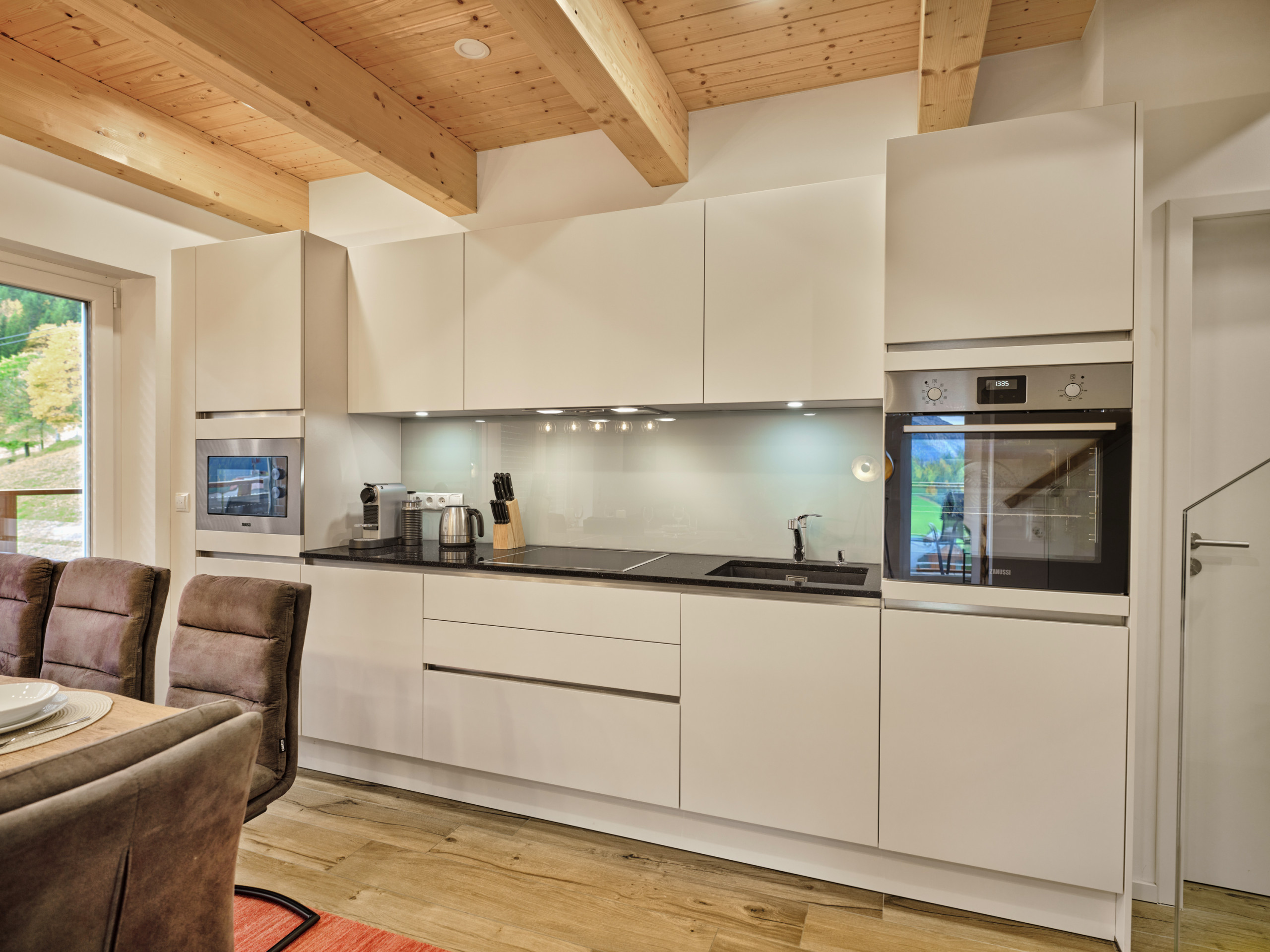 The modern holiday flat „Wasserfall Lodge C2“, Tauplitz, Salzkammergut is tastefully and modernly furnished. On 61 m² it offers space for 6 people. The apartment has 2 bedrooms (1 double bed, 2 single beds) as well as a comfortable sofa bed for 2 people in the living area, 1 bathroom, and 1 guest's toilet. The open kitchen is equipped with the latest appliances. This includes an induction hob, oven, dishwasher, Nespresso coffee machine, and of course, plenty of crockery and cutlery. From the private terrace, you can enjoy the unique view of the surrounding mountains and the ski slopes. The holiday flat has an underground parking space.