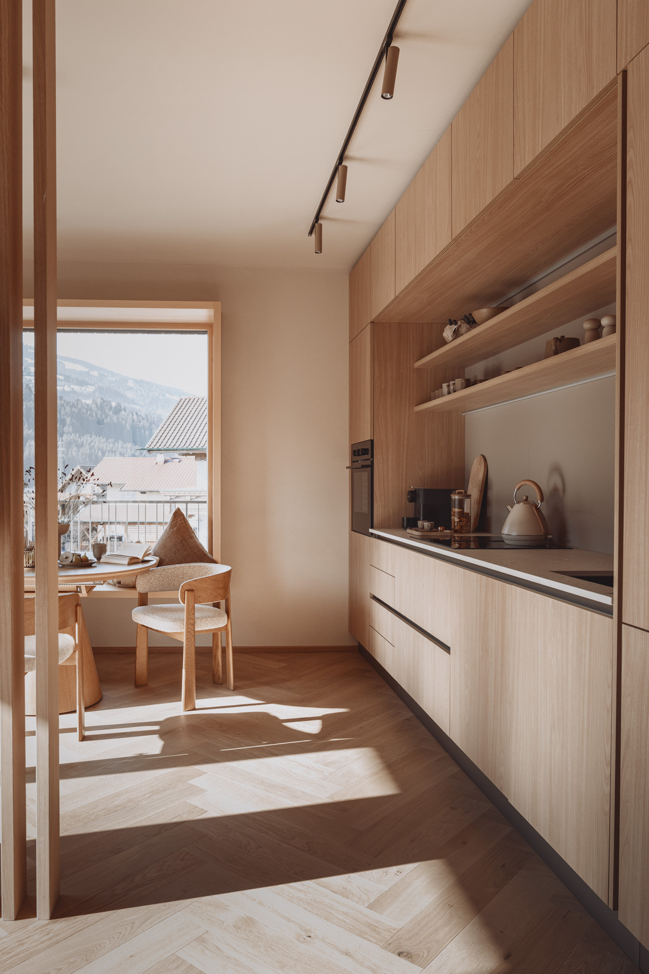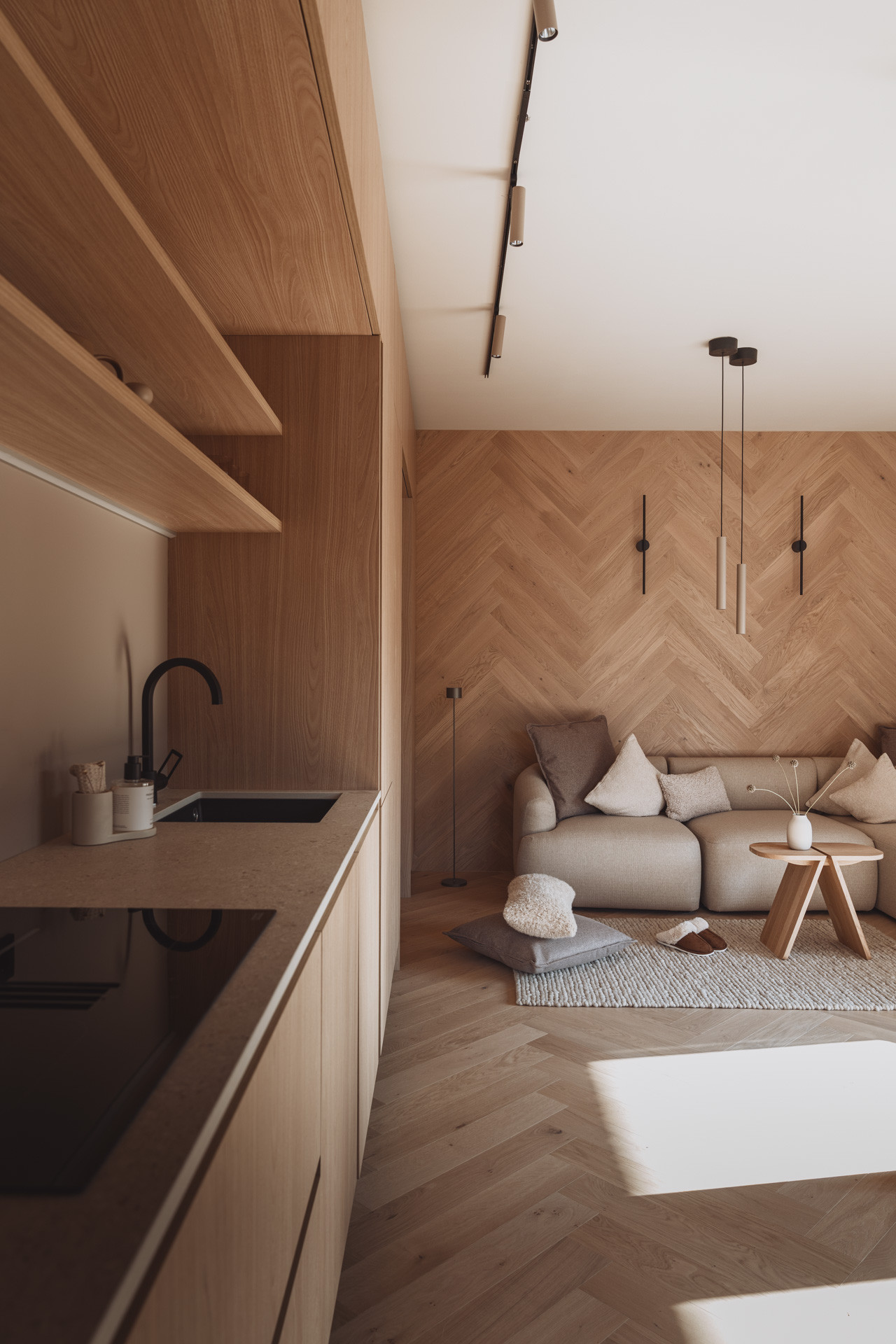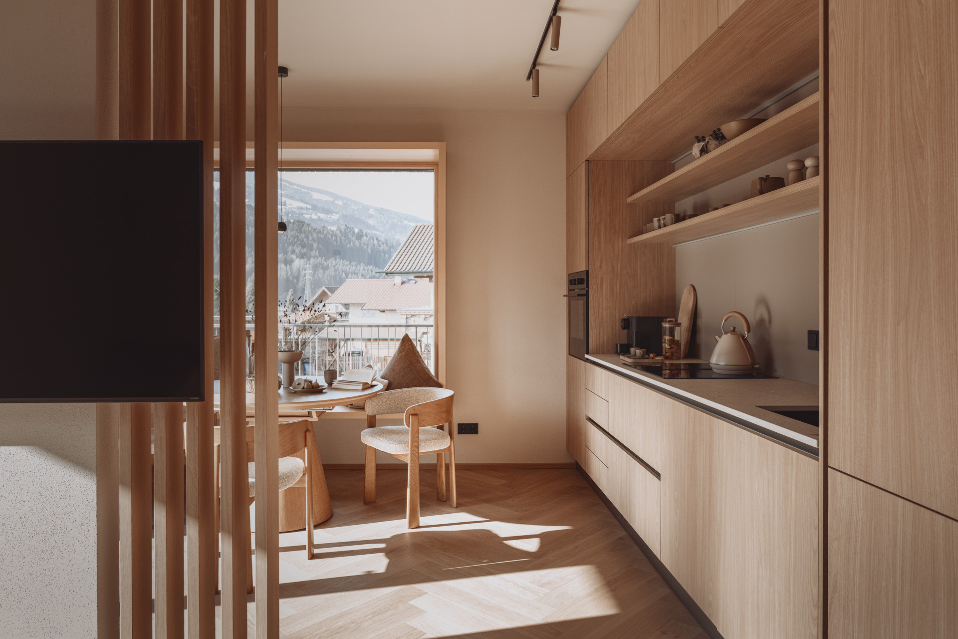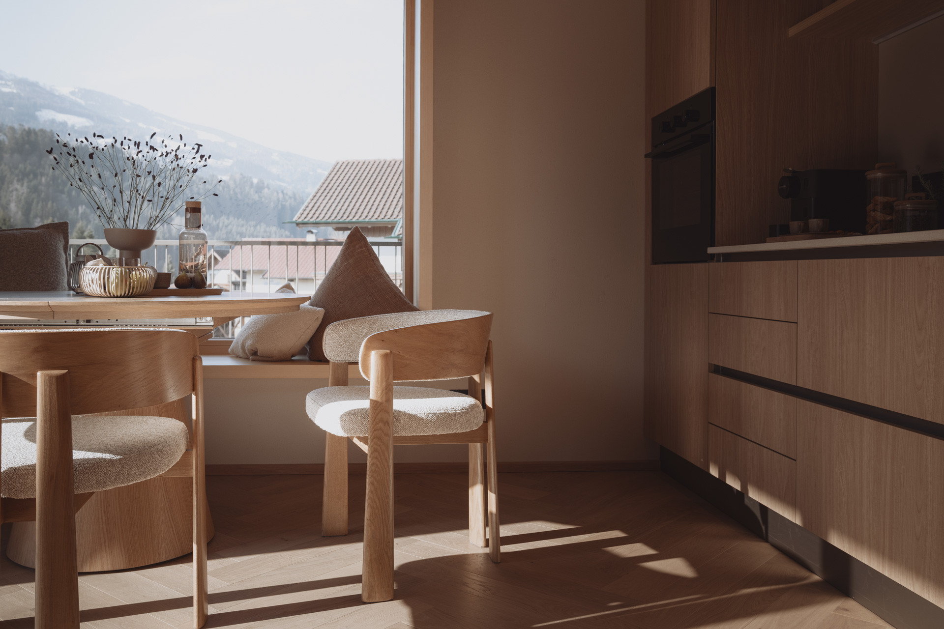 Die Suite besticht durch natürliche Klarheit und ruhige, reduzierte Linien. Mit zwei Schlafzimmern und zwei Badezimmern entsteht ein Platz zum Ankommen und Durchatmen. Die 65 m² große Suite verfügt über eine voll ausgestattete Küche mit Induktionsherd, Geschirrspüler und allen notwendigen Küchenutensilien. Großzügige Fenster holen die Natur ins Innere und verschmelzen so zu einem harmonischen Ganzen.