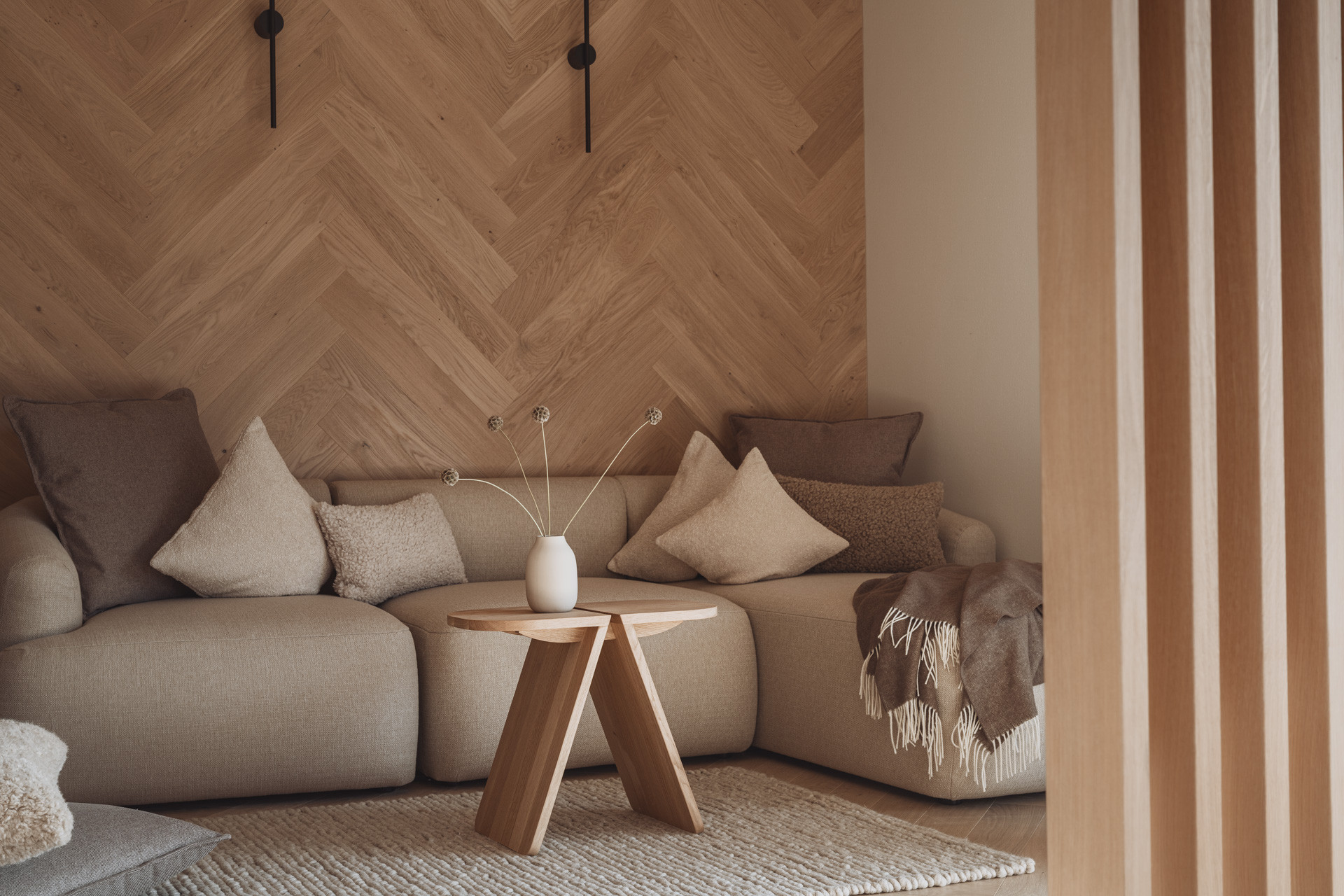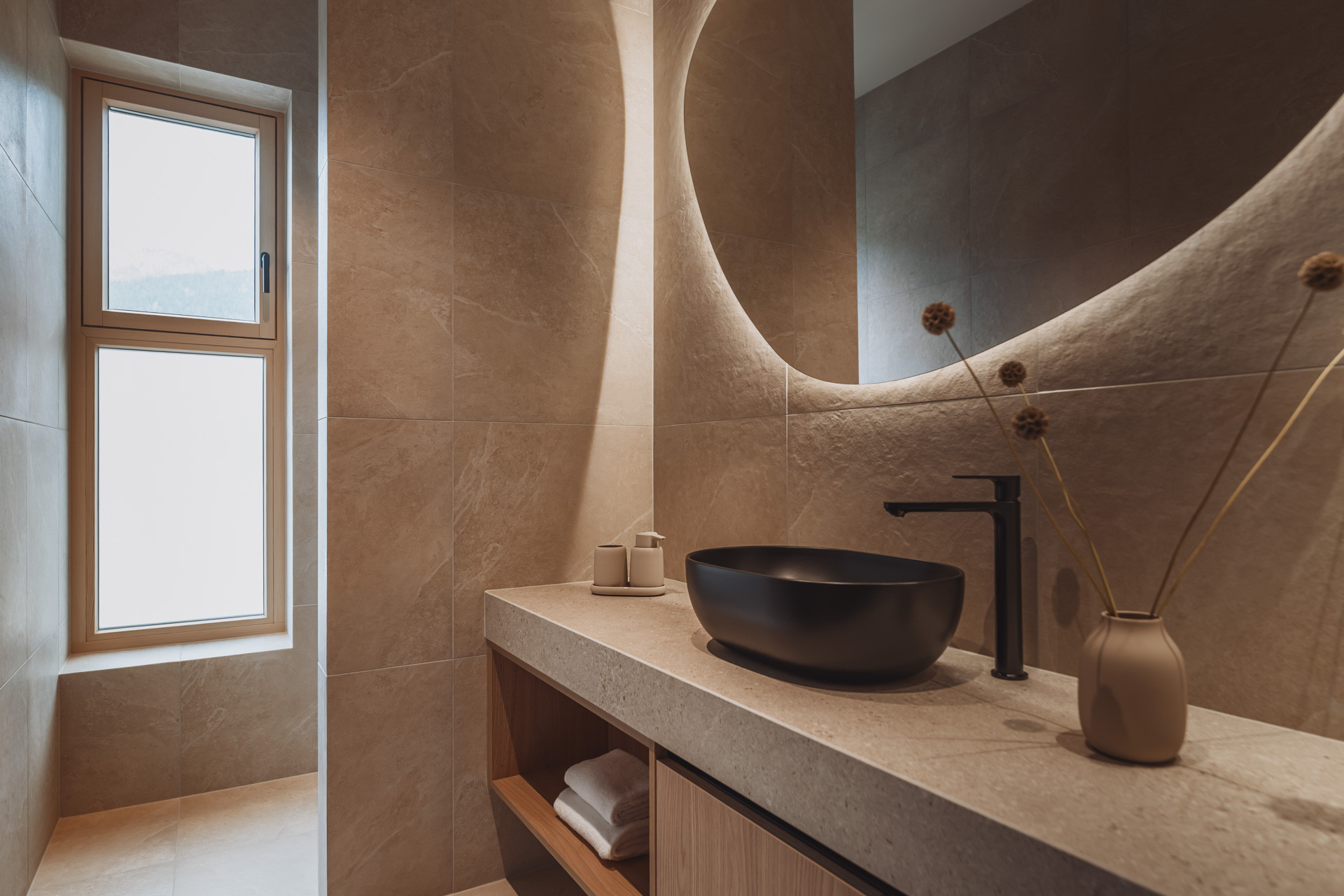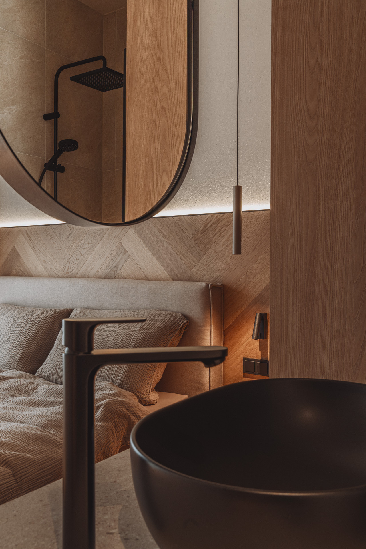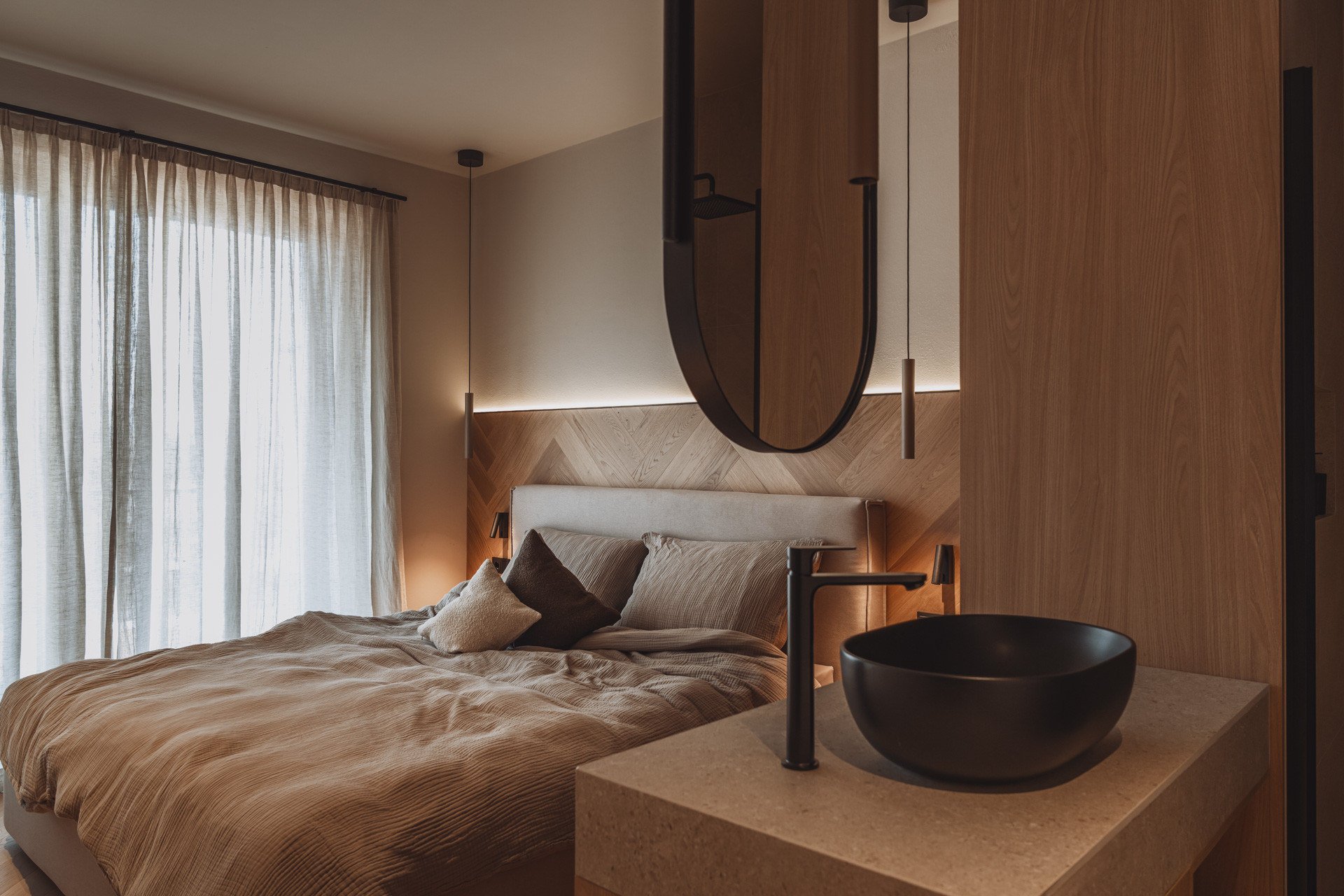 Die Suite besticht durch natürliche Klarheit und ruhige, reduzierte Linien. Mit zwei Schlafzimmern und zwei Badezimmern entsteht ein Platz zum Ankommen und Durchatmen. Die 65 m² große Suite verfügt über eine voll ausgestattete Küche mit Induktionsherd, Geschirrspüler und allen notwendigen Küchenutensilien. Großzügige Fenster holen die Natur ins Innere und verschmelzen so zu einem harmonischen Ganzen.