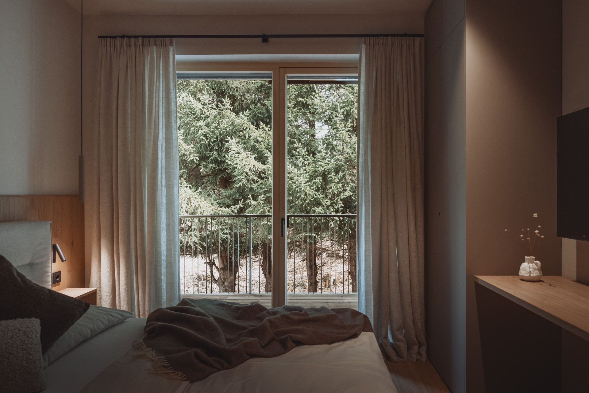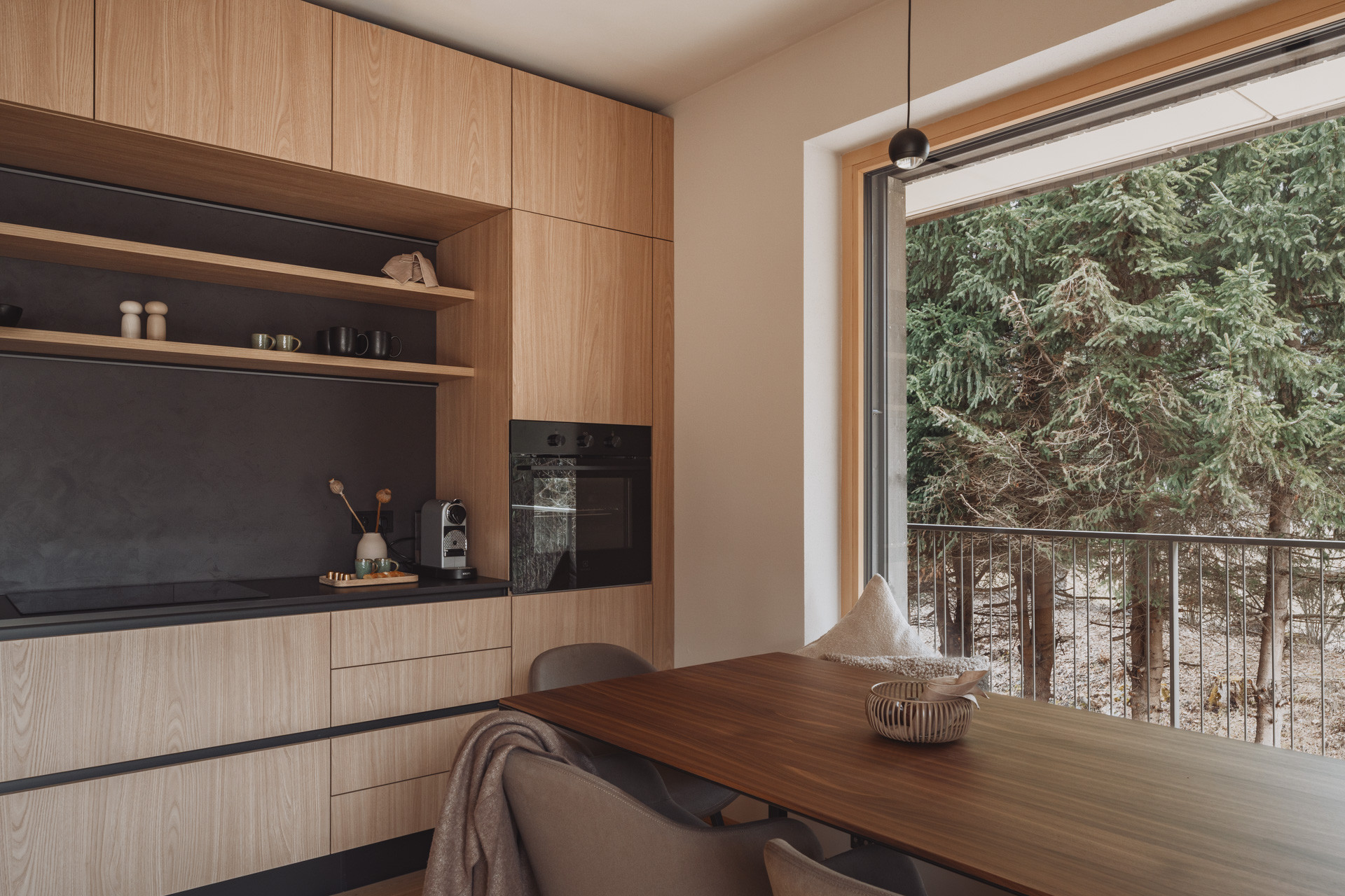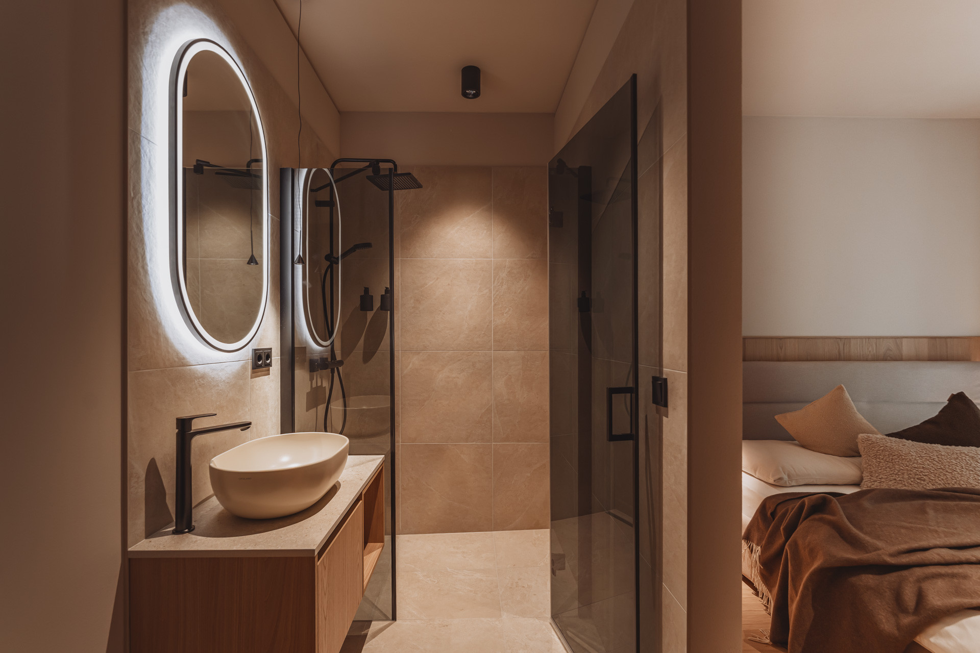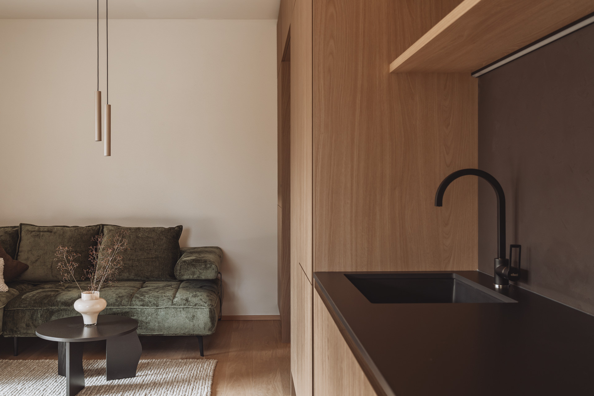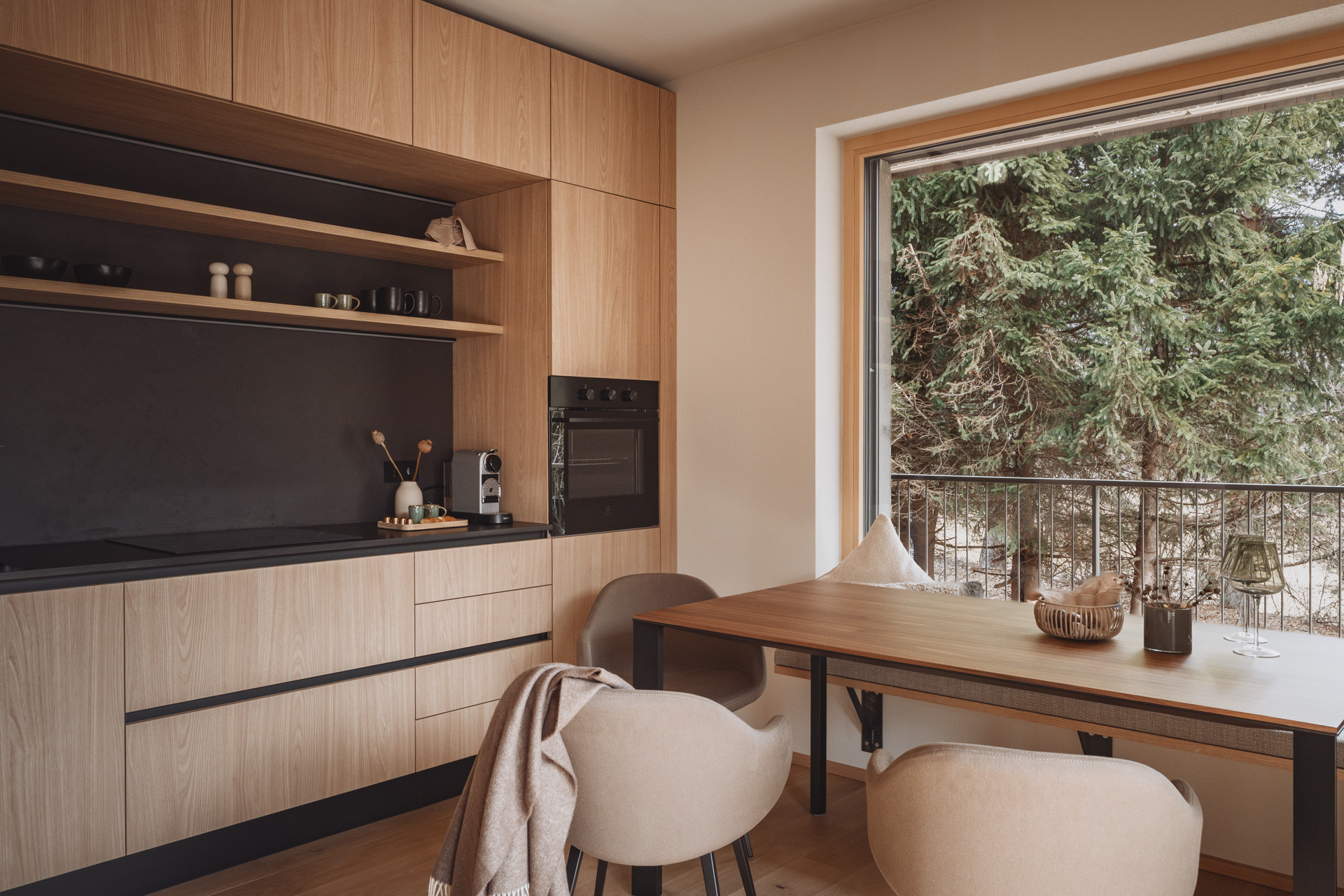 Die Suite besticht durch natürliche Klarheit und ruhige, reduzierte Linien. Mit zwei Schlafzimmern und zwei Badezimmern entsteht ein Platz zum Ankommen und Durchatmen. Die 65 m² große Suite verfügt über eine voll ausgestattete Küche mit Induktionsherd, Geschirrspüler und allen notwendigen Küchenutensilien. Großzügige Fenster holen die Natur ins Innere und verschmelzen so zu einem harmonischen Ganzen.
