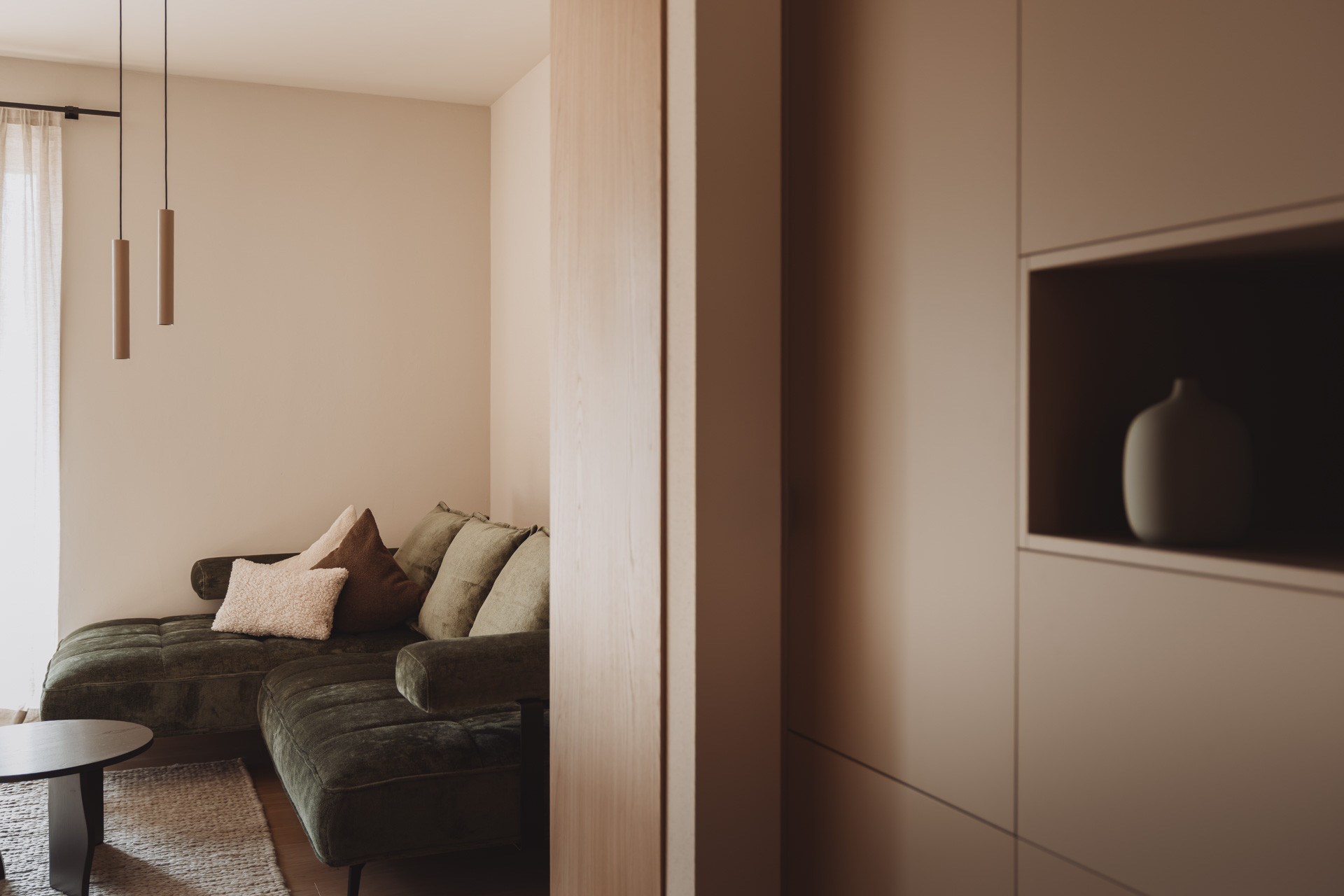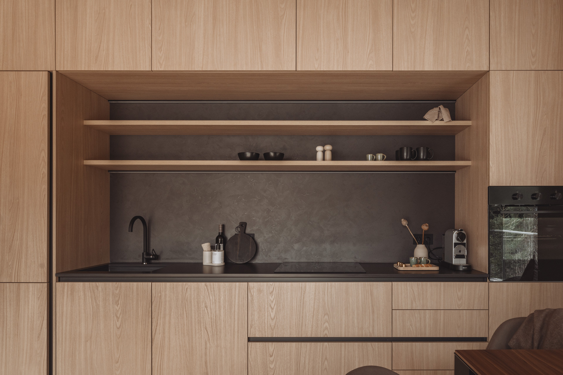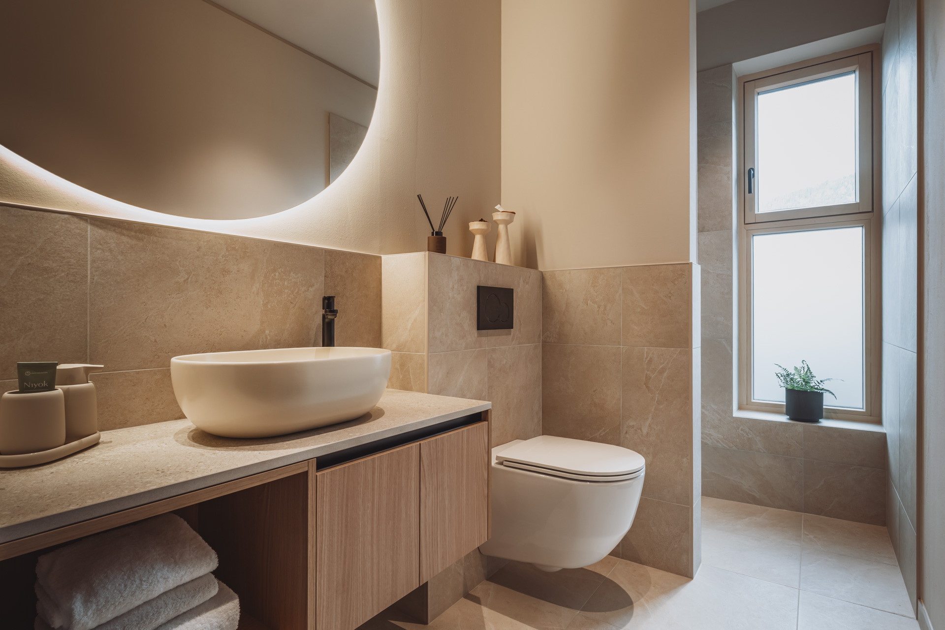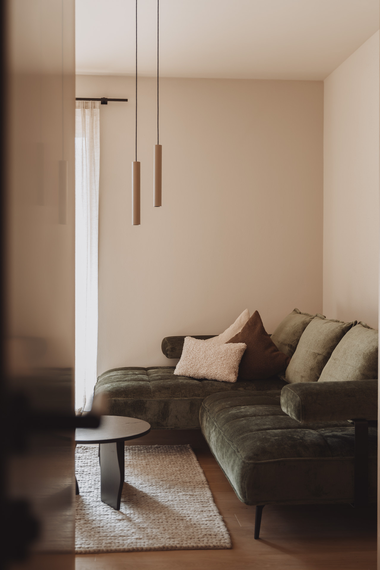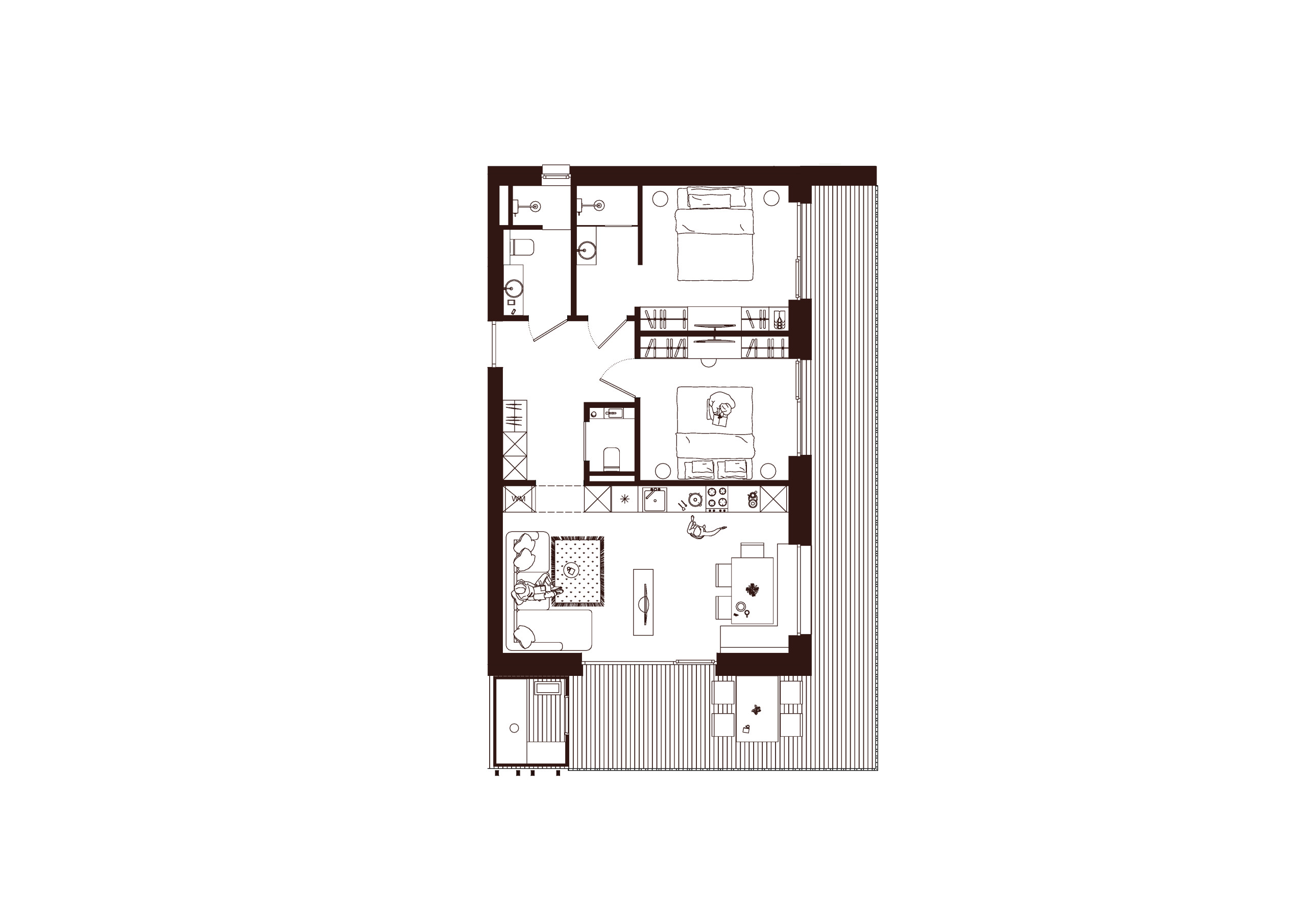 Die Suite besticht durch natürliche Klarheit und ruhige, reduzierte Linien. Mit zwei Schlafzimmern und zwei Badezimmern entsteht ein Platz zum Ankommen und Durchatmen. Die 65 m² große Suite verfügt über eine voll ausgestattete Küche mit Induktionsherd, Geschirrspüler und allen notwendigen Küchenutensilien. Großzügige Fenster holen die Natur ins Innere und verschmelzen so zu einem harmonischen Ganzen.